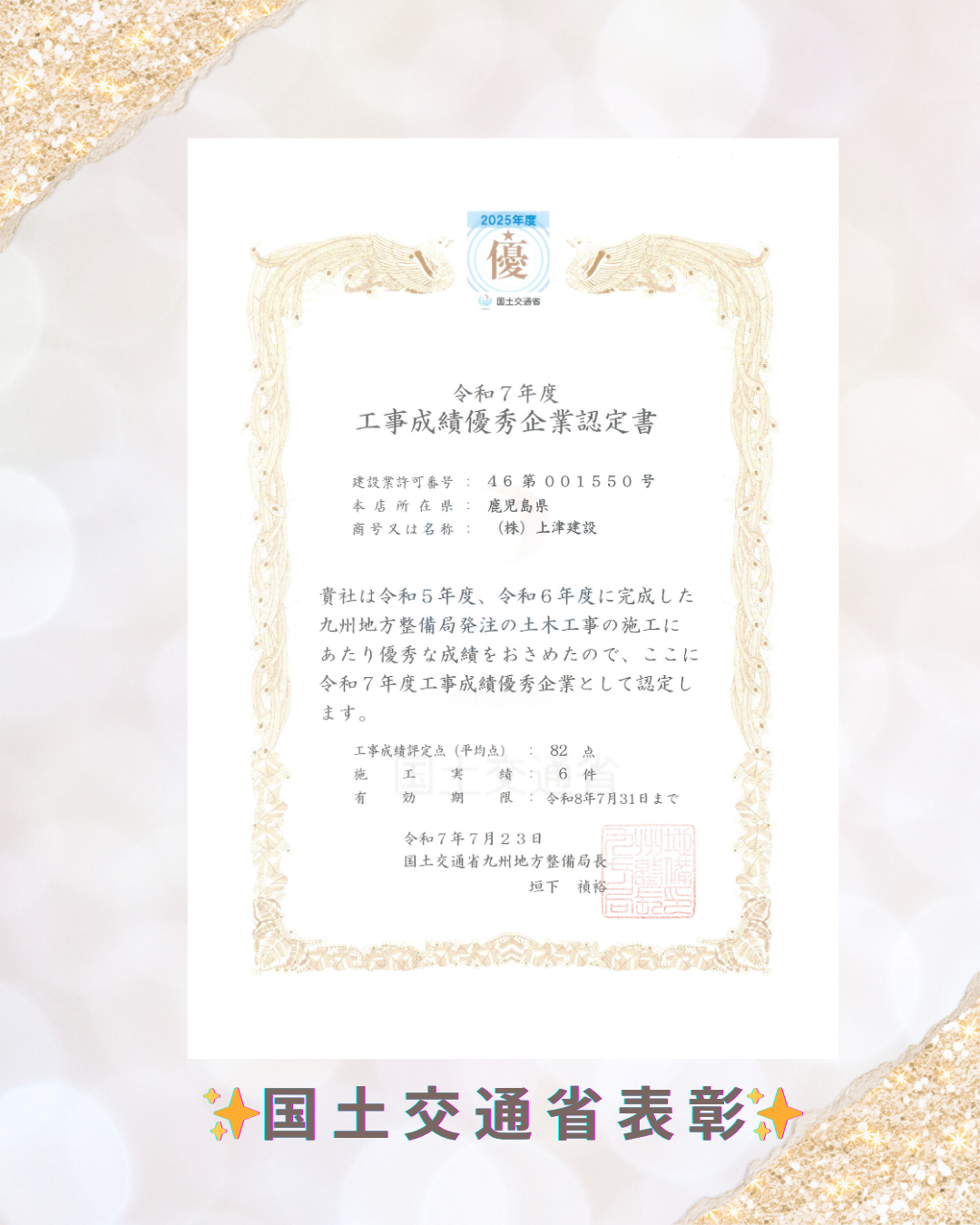 このたび弊社は、昨年に引き続き、令和7年度 国土交通省九州地方整備局により、「工事成績優秀企業」として認定されました。